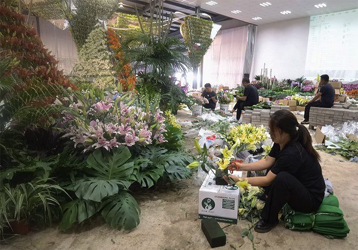 搭建會場獻(xiàn)花藝(李雪芹 攝)