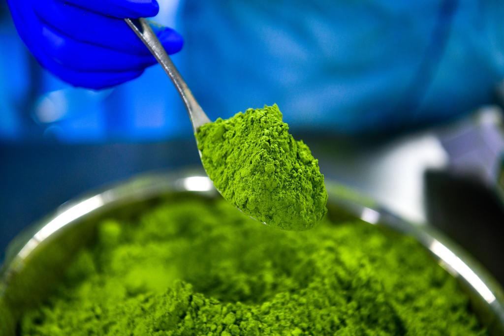 5月14日,在贵州省江口县贵茶产业园抹茶生产车间,工人在展示抹茶粉。
