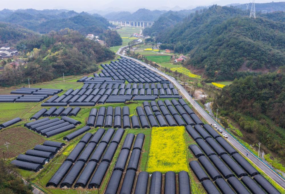 这是3月15日在宜昌市远安县花林寺镇慈化村拍摄的羊肚菌种植大棚(无人机照片)。