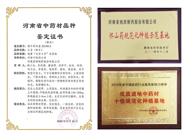 仲景宛西制藥是國內(nèi)首家提出“藥材好,藥才好”理念的企業(yè),有自建的中藥材種植基地,藥材地道,藥源清晰。是最早一批通過中藥材生產(chǎn)管理規(guī)范(GAP)認證的企業(yè)之一,得到了政府部門、行業(yè)協(xié)會等社會各界廣泛認可。其中懷山藥、懷地黃基地被授予“河南省規(guī)范化種植示范基地”、山茱萸基地“中國優(yōu)質(zhì)地道中藥材十佳規(guī)范化種植基地”。