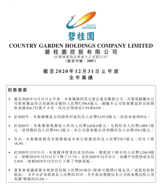 公告顯示,全年碧桂園營業(yè)收入4628.6億元,毛利約為1009.1億元,凈利潤541.2億元。得益于公司持續(xù)加強對回款目標的考核,強化標準化、精細化的管理機制,碧桂園的回款率依舊保持高位。截至期末,共實現(xiàn)權益合同銷售現(xiàn)金回款額約人民幣5193億元,權益回款率達91%,連續(xù)五年高于90%,在行業(yè)繼續(xù)保持領先,反映了強勁的自身造血功能。