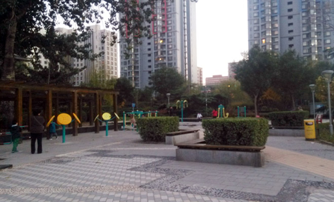 中心園林區(qū)呈現(xiàn)環(huán)狀結(jié)構(gòu),周邊依次排列著健身設(shè)施,遮陽長亭以及精神文明建設(shè)的標語。不少老年業(yè)主帶著孩子在此遛彎歇腳。