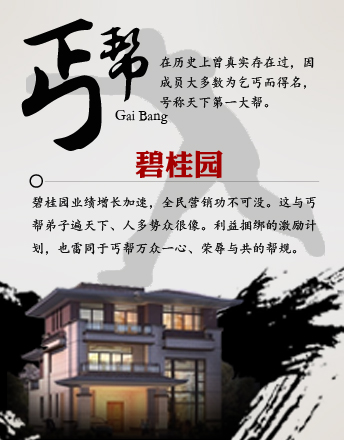 碧桂園 丐幫 丐幫因成員大多數(shù)為乞丐而得名,號稱天下第一大幫。 碧桂園是今年房企風頭最勁的一匹黑馬。和丐幫人多勢眾一樣,全民營銷,其躋身千億軍團的最大功臣。