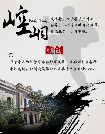 融創(chuàng) 崆峒派 崆峒武術特點在于奇兵,外形各異、攜帶方便, 往往暗藏于袖筒和靴筒中,交手中往往突然出擊取勝。今年頻頻拿地,其異于常人的經(jīng)營思路,讓孫宏斌招致各種爭議和質(zhì)疑。