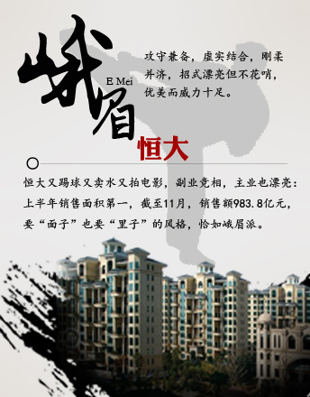 恒大 峨眉派 峨眉派攻守兼?zhèn)?,虛實結合,剛柔并濟,招式漂亮但不花哨。 恒大既搞副業(yè),又攻主業(yè),樣樣風生水起。年度銷售額新入圍千億俱樂部。要面子也要里子的風格,恰如峨眉派。