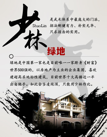 綠地 少林派 少林是體系最龐大的門派,招法剛健有力、攻防兼?zhèn)?、樸實無華。 綠地是中國首家躋身《財富》世界500強的,以房產(chǎn)為主業(yè)的企業(yè)。項目遍及全國,世界十大高樓近一半來自綠地。
