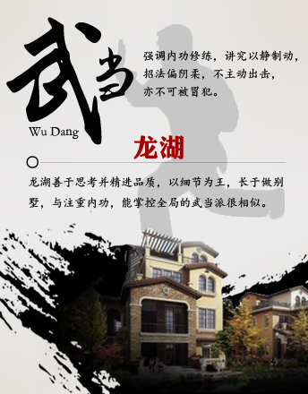 龍湖 武當派 武當強調(diào)內(nèi)功修練,以靜制動,一般不主動進攻,但亦不可輕易侵犯。 龍湖出手拿地都經(jīng)深思,經(jīng)營風格沉穩(wěn)凌厲,重細節(jié)品質(zhì)。與注重內(nèi)功,看似被動實能縱觀全局的武當派很像。