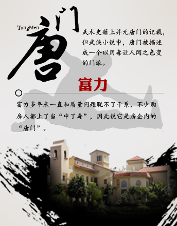 富力 唐門 唐門用毒之名,天下皆知。 富力擁有一級開發(fā)資質(zhì),卻總是遭業(yè)主維權。因壓縮成本、過快擴張導致的質(zhì)量問題一再曝光。讓購房人后悔不迭,因此說富力是房企內(nèi)的“唐門”。