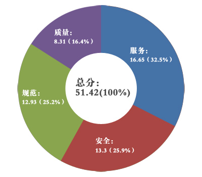 3、通過(guò)問(wèn)卷調(diào)查結(jié)果分析,金隅項(xiàng)目總分共51.42,其中服務(wù)占總比例32.50%,安全占總比例25.90%,規(guī)范占總比例25.20%,質(zhì)量占總比例16.40%。