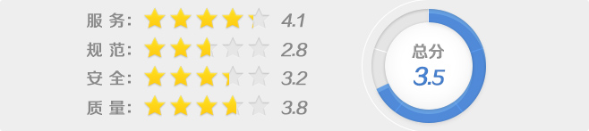 3、通過問卷調(diào)查結(jié)果分析,金隅項目總分共3.5星,服務(wù)等級為4.1星,安全等級為3.2星,規(guī)范等級為2.8星,質(zhì)量等級為3.8星。