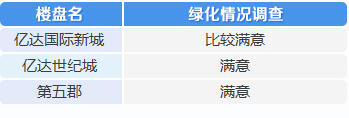 根據(jù)上表可以看出:調(diào)查問卷中的三個項目,居民對小區(qū)綠化都表示滿意,記者在走訪調(diào)查中發(fā)現(xiàn),億達多個小區(qū)整體環(huán)境干凈、整齊,規(guī)劃很合理,以普通住宅區(qū)的標準來衡量,其綠化率、植物種類等算是超過同類標準。