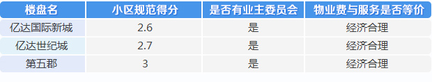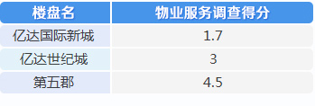 在物業(yè)服務(wù)調(diào)查過程中,第五郡分數(shù)最高為4.5分,億達國際新城得分最低,為1.7分。