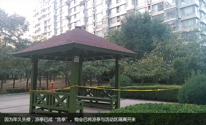 記者在調(diào)查中還發(fā)現(xiàn)了位于小區(qū)中心廣場的一處涼亭,周邊被圍上了一圈警戒帶。有居民告訴記者,這個涼亭因為年久失修,現(xiàn)已成了“危亭”,需要及時翻新或是重建,目前物業(yè)只是將亭子與居民活動區(qū)隔離開來,并沒有進一步的修整動作。
