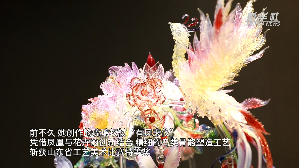 前不久,她创作的琉璃权杖“有凤来仪”凭借凤凰与花卉的创新结合、精细的鸟类骨骼塑造工艺,斩获山东省工艺美术比赛特等奖。