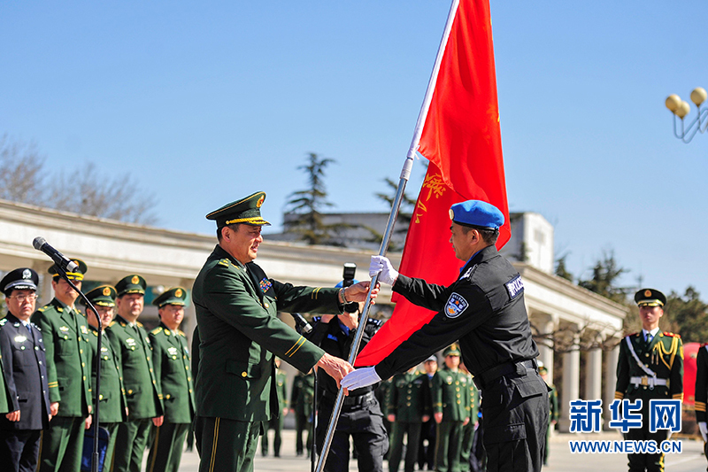 公安部邊防管理局局長(zhǎng)陳定武為第四支赴利比里亞維和警察防暴隊(duì)授旗。丁小添 攝