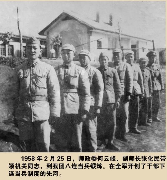 ????1958年8月,毛澤東主席在北戴河召開的中央政治局?jǐn)U大會議上講話指出:“我們的軍官,像云南的一個師長,一年當(dāng)一個月兵,我看這是好辦法?!@樣,我們的軍隊就是永遠(yuǎn)打不散的軍隊?!泵飨谥械膸熼L,實際是當(dāng)時的師政委何云峰,而下連當(dāng)兵的地方便在該團(tuán)三營八連,八連也被譽(yù)為下連當(dāng)兵第一連。