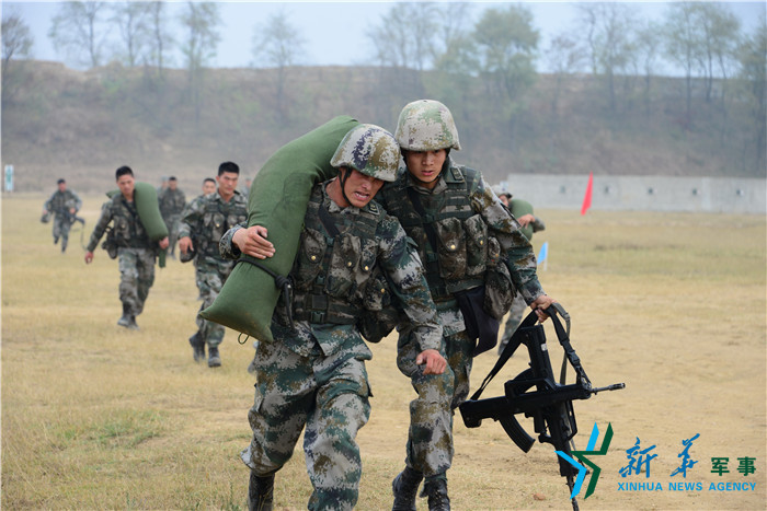 2015年10月22日,部隊(duì)組織百人反恐突擊隊(duì)考核,圖為隊(duì)員模擬搬運(yùn)傷員