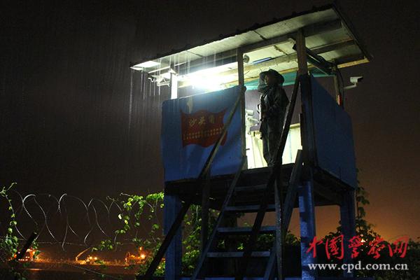 ????崗?fù)ど?,燈光下,筆直的身影密切注視著營區(qū)四周,曾經(jīng)有小偷趁雨夜藏匿海邊的雜草叢中,隊員及時發(fā)現(xiàn)并驅(qū)離,在雨夜里隊員們格外警惕,確保營區(qū)安全。(邵梁攝)