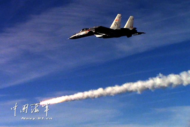 ↑資料照片:殲-15艦載戰(zhàn)斗機發(fā)射導(dǎo)彈。