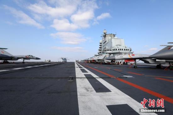 資料圖:2016年12月23日,在黃海某??沼?,多批次殲-15艦載戰(zhàn)斗機從遼寧艦飛行甲板起飛升空,開展了空中加受油、空中對抗等多項訓(xùn)練任務(wù)。 中新社發(fā) 莫小亮 攝