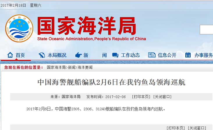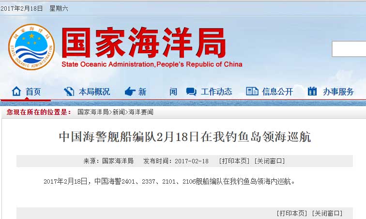新華網(wǎng)北京2月18日電 據(jù)國家海洋局網(wǎng)站報道,2017年2月18日,中國海警2401、2337、2101、2106艦船編隊(duì)在我釣魚島領(lǐng)海內(nèi)巡航。