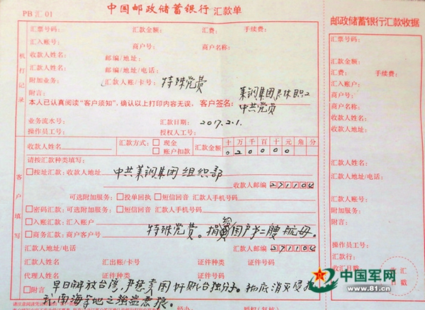 而2012年那筆匯款的辦理員馬慧對“中共黨員”還有印象。她說,老人很客氣,寫附言時還跟她提到國家正在改造建設的航空母艦,很興奮的樣子。辦完業(yè)務,老人還遞過來一張紙條,上面寫著:請?zhí)嫖冶C埽x謝!