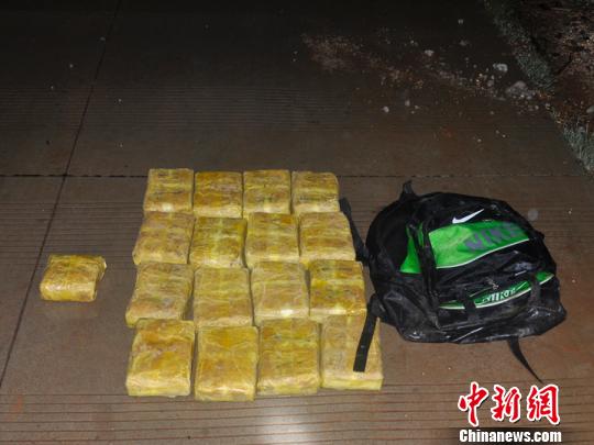 ????20時(shí)07分許,一名男子駕駛一輛無牌照摩托車冒著大雨,趁著夜色慢慢駛?cè)氩榫儸F(xiàn)場,當(dāng)看到執(zhí)勤官兵示意停車檢查時(shí),該男子在距查緝現(xiàn)場15米處調(diào)頭逃跑,掉頭過程中從摩托車上掉下一個(gè)黑色雙肩包,執(zhí)勤官兵當(dāng)場從黑色雙肩包內(nèi)查獲用透明黃色蠟紙包裹的毒品可疑物17塊,凈重11.396公斤。