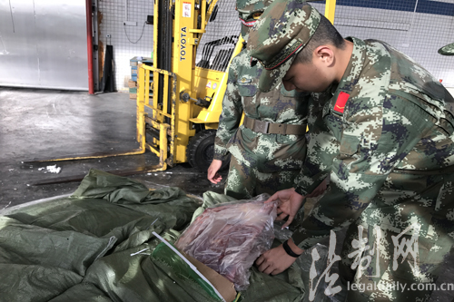 圖為邊防官兵正在清點走私凍肉