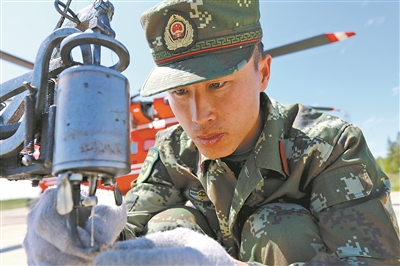日曬、風吹、雨淋,直升機的“衣服”——蒙布發(fā)生破損怎么辦?這可難不住心靈手巧的官兵。你看,武警森林指揮部直升機支隊的代理機械師王丹宇就自己動手,從老鄉(xiāng)那里借來手搖修鞋機,頂著盛夏的烈日一針一線仔細修補,看起來還挺有小裁縫的范兒呢。韓興華 攝