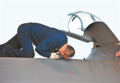7月7日下午,空軍某飛訓基地組織跨晝夜飛行。戰(zhàn)機歸來后,一名機械師單膝跪在機翼上,臉緊貼戰(zhàn)機縫隙檢查動作筒有無漏油。由于工作需要,機務人員經常需要彎腰低頭、鉆進狹小機艙,有時一彎就是小半天,很容易患上腰肌勞損等常見病,但為了讓飛機不“帶病”上天,這名機械師把身體彎成了與座艙蓋相似的弧度。徐晨桐、靳翚淇 攝影報道