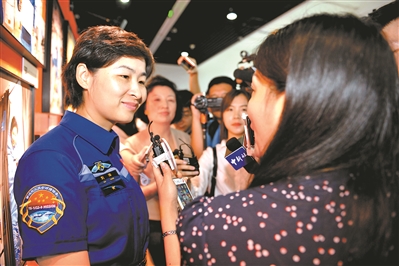 中國人民解放軍航天員大隊航天員劉洋在展覽現(xiàn)場接受媒體記者的采訪。本報記者 宋雯 攝