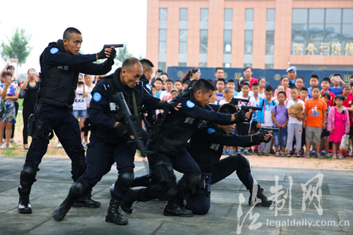 圖為特戰(zhàn)隊員為小學生們進行“維和礪劍”科目表演
