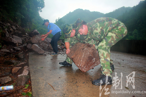 圖為鑒江邊防派出所官兵正齊心協(xié)力轉(zhuǎn)移落石