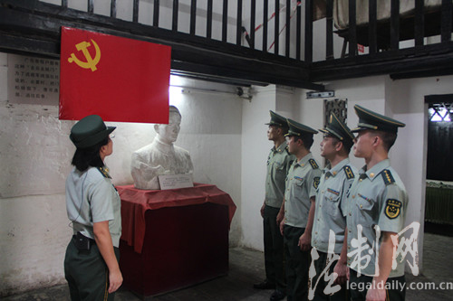 圖為貴港邊防檢查站黨員官兵在參觀革命時期地下黨員們?nèi)朦h宣誓的場地和瞻仰先烈的雕像