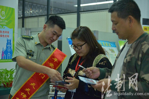 圖為檢查員向旅客發(fā)放宣傳資料