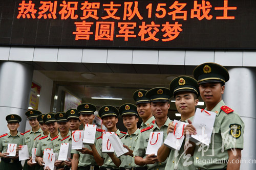 ????昔日禁毒反恐當尖兵,今朝題名金榜站排頭!正當各地紛紛樂道高考升學率的同時,南粵邊防警營也傳來喜報。8月28日,深圳銀湖山訓練基地里處處洋溢著喜悅;禁毒尖兵、狙擊手、士官楊平申等來至廣東公安邊防總隊機動支隊的15名戰(zhàn)士喜圓軍校夢,被廊坊武警學院、公安邊防高等專科學校等3所部隊院校錄取,戰(zhàn)友們?yōu)樗麄兣e行簡樸而隆重的歡送儀式。據(jù)悉,連續(xù)多年來,這個支隊在廣東邊防總隊40多個基層單位中戰(zhàn)士升學率名列前茅。