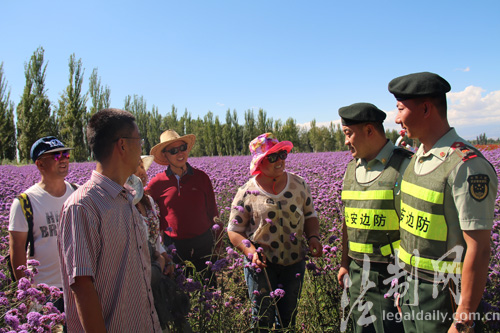 ????每年6月、7月,數(shù)萬畝薰衣草爭相怒放,匯成一片紫色的海洋,吸引大量游客前去觀賞。新疆公安邊防總隊(duì)伊犁邊防支隊(duì)梁三宮邊防派出所官兵因地制宜打造“紫郁之鄉(xiāng)110”這一特色警務(wù),在治安防控、服務(wù)群眾、素質(zhì)提升等方面走出了一條新路子,用使命、責(zé)任與情感為游客保駕護(hù)航,讓游客享受一趟“滿意之旅”。