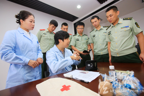 圖為醫(yī)護人員在邊防派出所為官兵講解警用裝備包中急救物品的使用方法及注意事項