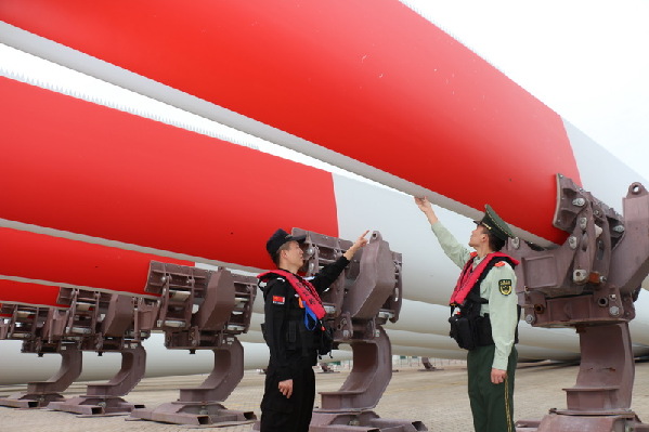 福建莆田邊檢站官兵正在對(duì)巨型風(fēng)電葉片進(jìn)行安全檢查