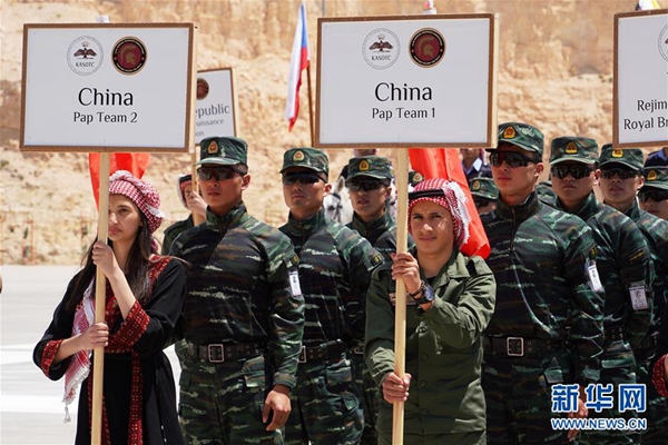 4月30日,在約旦阿卜杜拉國(guó)王特戰(zhàn)訓(xùn)練中心,中國(guó)武警代表隊(duì)隊(duì)員(后)參加“勇士競(jìng)賽”國(guó)際特種兵比武。新華社記者 林曉蔚 攝