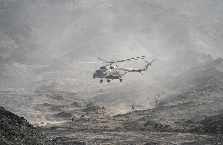 ????23日清晨,荒山丘陵遍布的庫爾勒訓練基地,某特戰(zhàn)旅特戰(zhàn)分隊乘坐直升機迅速向“恐怖分子”的營地機動,演練的第一個課目就這樣毫無征兆地打響。