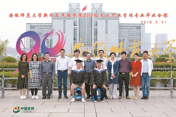 5月21日,安徽師范大學(xué)新聞與傳播學(xué)院組織應(yīng)屆畢業(yè)生拍攝畢業(yè)照,眾多班級(jí)的學(xué)生依次排隊(duì)拍攝,其中一個(gè)班級(jí)與眾不同——只有兩名學(xué)生,而與他倆合影的卻有11名老師。并且,11名老師站在后排,兩名學(xué)生坐在前排。當(dāng)相機(jī)的快門摁下之后,這張照片成為該校濃厚尊崇軍人氛圍的亮麗名片。