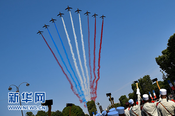 7月14日,在法國巴黎舉行的國慶閱兵儀式上,“法蘭西巡邏兵”飛行表演隊飛過香榭麗舍大街。新華社記者 陳益宸 攝