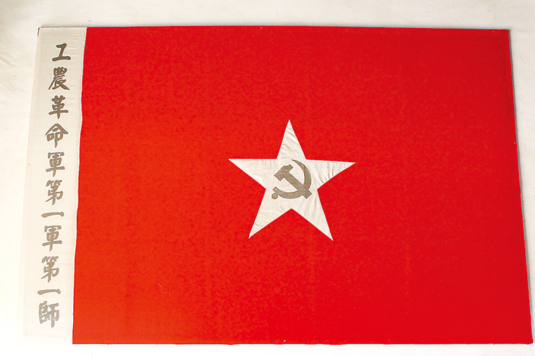軍旗的樣式:旗底為紅色,象征革命;旗中央是白色的五角星,代表中國共產(chǎn)黨的領(lǐng)導(dǎo);五角星內(nèi)鑲嵌交叉的黑色鐮刀和斧頭,表示受苦受難的工農(nóng)大眾緊密團結(jié)起來;旗面左側(cè)靠旗桿一側(cè)有一條十厘米寬白布條,上面豎寫著“工農(nóng)革命軍第一軍第一師”黑色字樣的番號。這面莊嚴威武軍旗的完整含義是:工農(nóng)革命軍第一軍第一師是中國共產(chǎn)黨領(lǐng)導(dǎo)的工農(nóng)革命武裝。