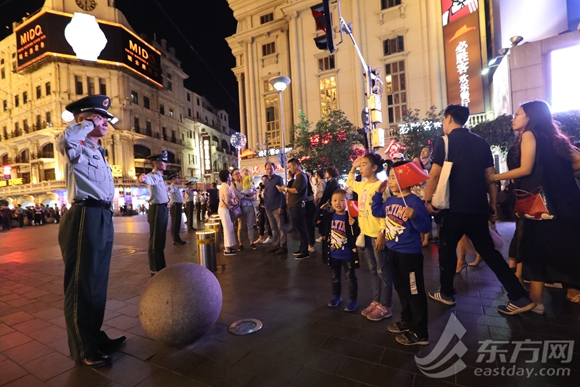 10月4日晚上20時30分,在南京東路與湖北路交叉口,武警上海總隊(duì)執(zhí)勤五支隊(duì)官兵正在疏導(dǎo)游客,突然手持國旗的3名小朋友走到執(zhí)勤官兵面前,朝著執(zhí)勤的戰(zhàn)士敬了個禮,并向執(zhí)勤的戰(zhàn)士說:“叔叔,您辛苦了。”隨后,執(zhí)勤的戰(zhàn)士也向3位小朋友回敬了一個軍禮。這溫馨的一幕,被網(wǎng)友用手機(jī)拍照記錄,發(fā)到微信朋友圈中,感動了不少人。
