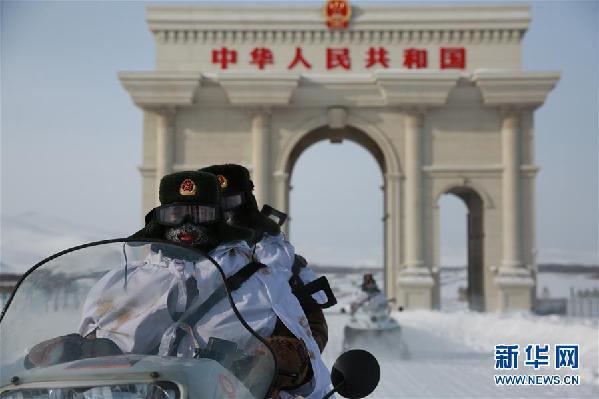 ????黑龍江東極哨所官兵騎摩托雪橇在黑瞎子島上巡邏(2018年1月31日攝)。新華社記者 琚振華 攝