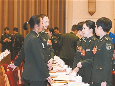 ??? 三月七日上午,出席十三屆全國(guó)人大二次會(huì)議的解放軍和武警部隊(duì)代表團(tuán)舉行第一次全體會(huì)議。會(huì)議間隙,女代表們相互討論交流。解放軍報(bào)記者 馮凱旋攝