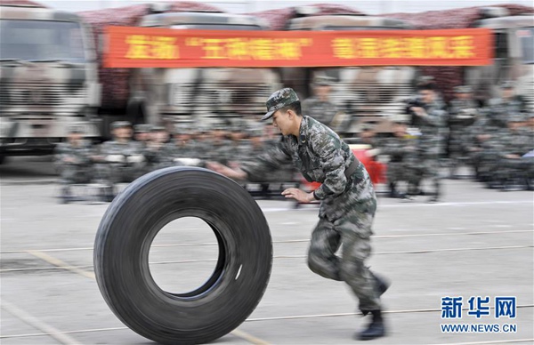 5月6日,沈陽聯(lián)勤保障中心某汽車運(yùn)輸旅一營戰(zhàn)士在軍體比武上進(jìn)行滾輪胎接力賽。新華社記者 許暢 攝