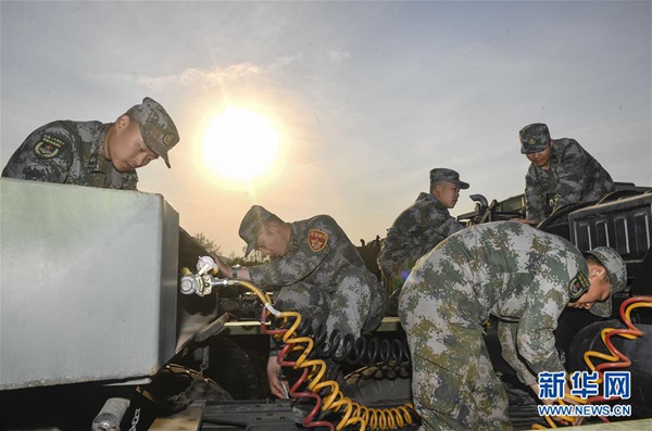 5月9日,沈陽聯(lián)勤保障中心某汽車運(yùn)輸旅一營戰(zhàn)士對車輛進(jìn)行維修保養(yǎng)。新華社記者 許暢 攝