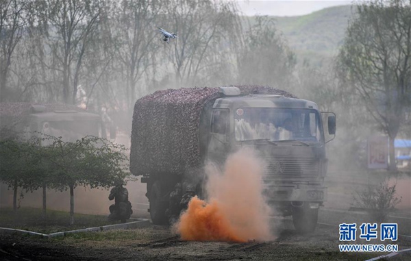 5月6日,沈陽聯(lián)勤保障中心某汽車運(yùn)輸旅一營戰(zhàn)士進(jìn)行無人機(jī)處突演練。新華社記者 許暢 攝
